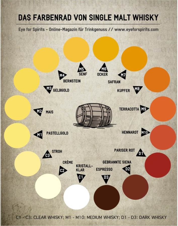 So solltest du vorgehen: Achte zunächst drauf, dass du einen Whisky hast, der kein Zuckercouleur enthält. Danach suchst du dir eine Übersicht über die verschiedenen Farbstile eines Whiskys und findest heraus, welche Aromen häufig damit einhergehen.